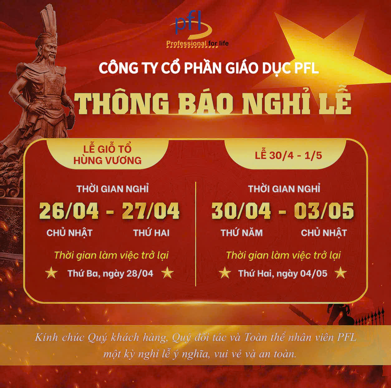 Công ty Cổ phần Giáo dục PFL xin trân trọng thông báo đến Quý đối tác, Quý khách hàng cùng toàn thể cán bộ nhân viên về lịch nghỉ lễ nhân dịp Giỗ Tổ Hùng Vương và Ngày Giải phóng miền Nam 30/4 – Quốc tế Lao động 1/5 như sau:
